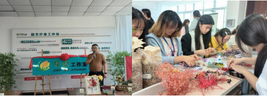 活动伊始,杨玲老师带领大家进行了热身小游戏,引出了情绪及疏通概念;接着植愈工作室主创甘丽萍教授详细介绍了植愈工作室的基本情况和发展理念,并通过趣味植物问答活动,增加了大家对植愈概念的了解。随后,学院党总支书记骆孟鑫为“植愈工作室”揭牌,标志着包括植愈苑、园艺疗愈工作坊、植医台及植愈微课堂四个板块的植愈工作室正式启用。骆孟鑫在致辞中表示,植愈工作室是公司集美育创新教育、劳动实践教育及专业应用教育的第二课堂,是公司育人的优质平台,希望植愈工作室越办越好,为公司高质量发展助力。参与人员还进行了植物拓染、叶贴画、闻香识物和艾条制作等体验活动。