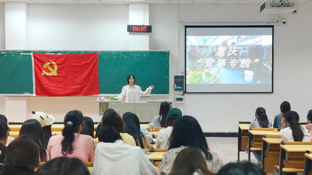 本次学习由丁慧琳领学。丁慧琳分别从“述”、“评、“论”三个关键词对“背篓专线”展开讲述。重庆背篓专线是重庆轨道交通四号线连接石船镇至市中心的一条路线,因该路线常有农民背着背篓带着新鲜蔬菜至市中心贩卖而被亲切称呼为“背篓专线”。这条专线之所以会得到大家的点赞,是因为“背篓专线”不仅有利于改善民生,更体现了这座城市的精神文明与人文关怀。活动最后,丁慧琳又以视频和故事的形式让同学们对“背篓专线”背后的城市温度有了更加深刻的理解。
