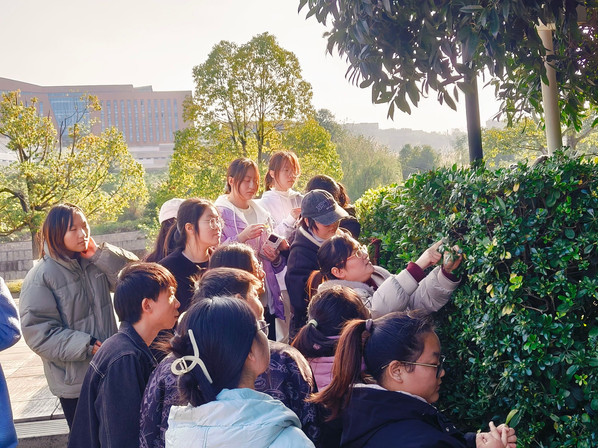 在刘铭老师的带领下,同学们从慎思楼2栋出发,边观察边移动到莲花广场中心附近。活动期间,刘铭老师对植物叶片发黄、枯萎、出现病斑等现象进行详细叙述,并讲解如何通过植物的外观症状、生长环境等因素初步判断病害类型,如真菌性病害常伴有霉状物,细菌性病害多出现脓状物等,同时,采集了部分病害样本至实验室进一步观察确认病害。参与活动的同学表示:“这次活动在轻松愉快的氛围中开展,不仅缓解了学习压力,也让我意识到看似平常的植物病害可能会对校园生态产生较大影响,以后会更加留意身边植物的生长状况。”