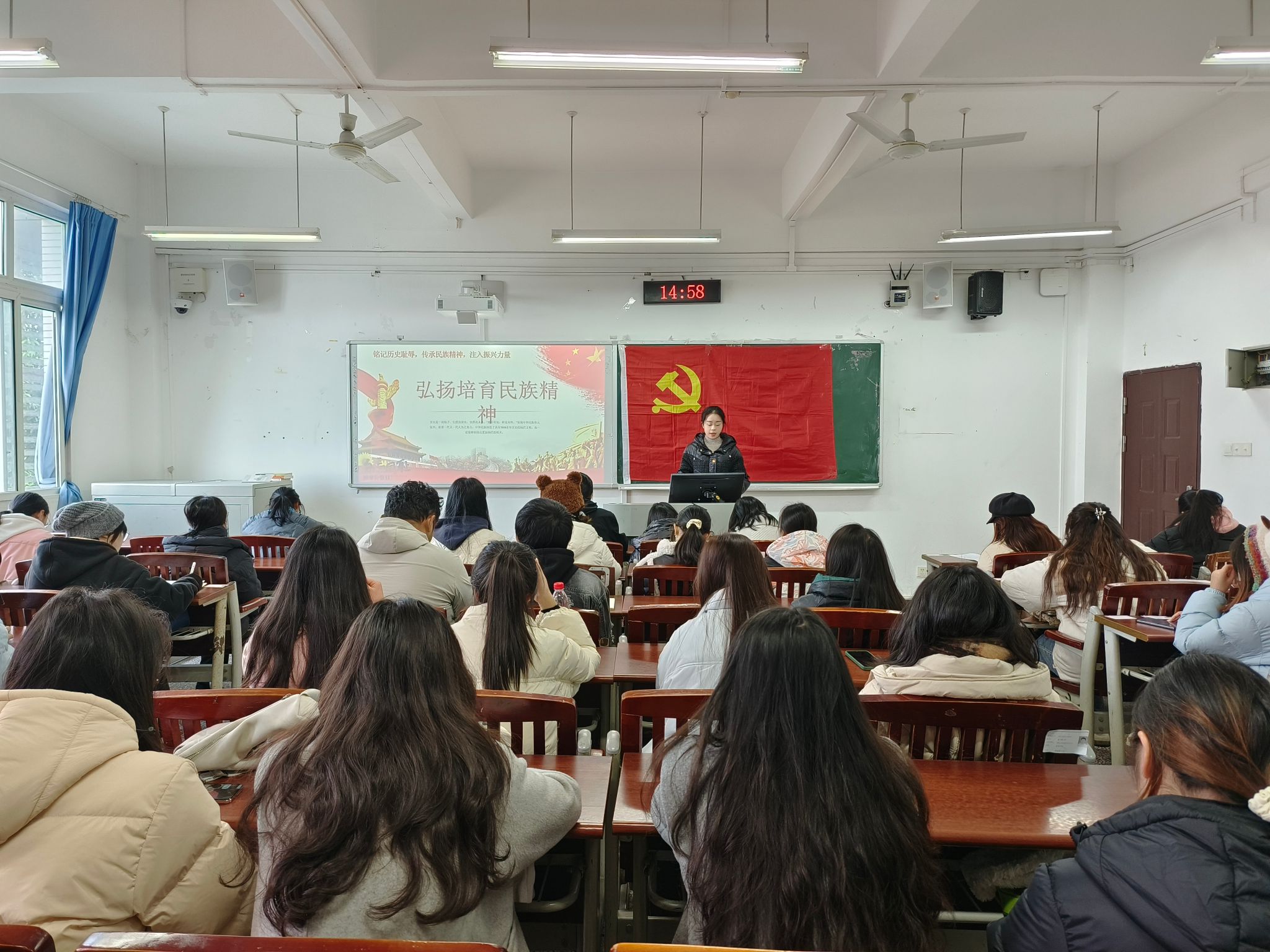 活动开始,主讲人陈绘雯同学首先为大家介绍了什么是民族精神,并从民族精神的发展,以国家公祭日为例,辅以视频为同学们讲解了民族精神的内涵,让同学们更加直观地理解民族精神,呼吁同学们要不忘历史,牢记使命,分享如何培养民族精神。活动的最后,同学们纷纷表示这次活动让他们受益良多,作为新时代的青年,他们会努力奋斗,为国家发展贡献自己的力量。