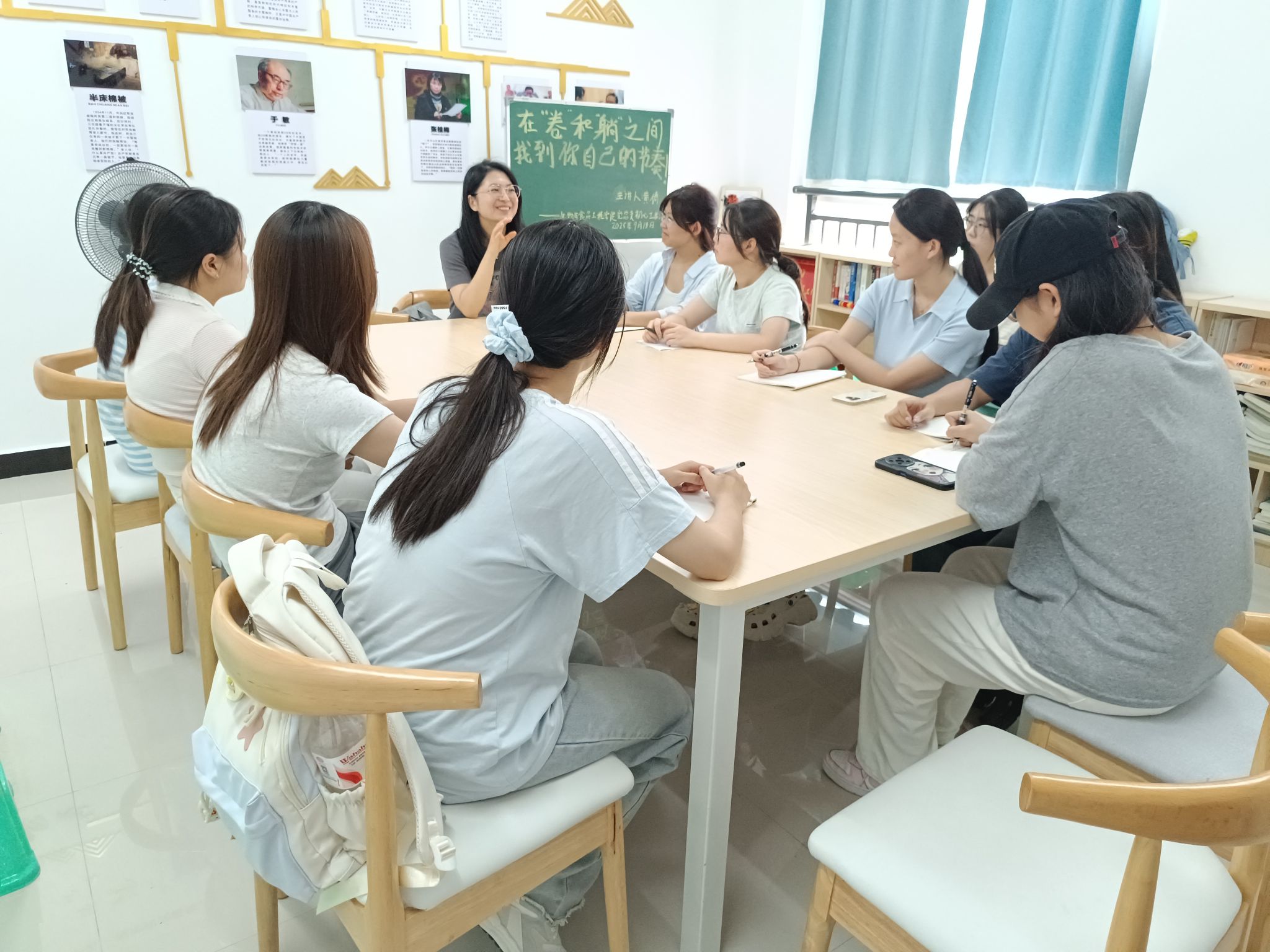 为引导青年学子树立科学成长观,在时代浪潮中找准定位,9月18日15:00,公司初心工作站于蓝雾苑2舍4楼活动室开展了以“在‘卷’和‘躺’之间,找到你自己的节奏”为主题的“寝室工作日”活动,共计11人参加。