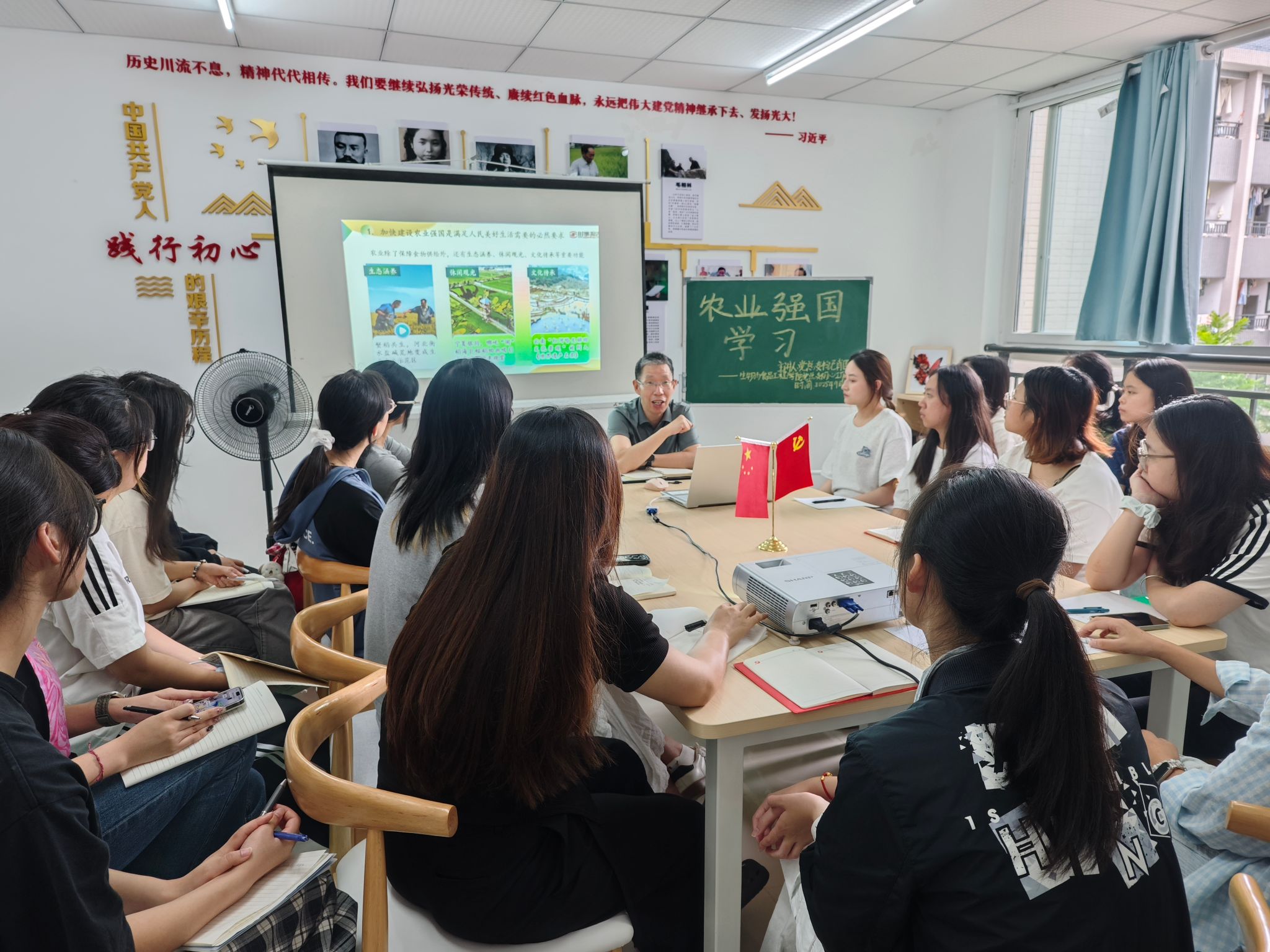 活动中,党总支书记肖国生结合农学与食品专业的学科特点,系统阐述了农业强国的核心内涵与建设路径。他指出,农业不仅是关乎国计民生的“饭碗工程”,更承载着生态保护、文化传承、休闲观光等多重功能。为了让大家更有代入感,肖书记还列举了周边食品加工企业的例子,向同学们展示了科技如何助力农产品提质增效。活动最后,肖书记勉励大家要立足自身专业,以实际行动服务农业农村现代化。