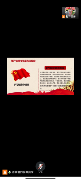 本次会议由员工第一党支部书记许美琳同志主持。她从党章的概述、发展历程等方面为大家详细阐述了党章的基本内容以及新时代的党章要求,督促大家自觉遵从党章并严格执行和维护党的纪律;另一方面以共产党人的初心和使命为切入点,带领大家共同学习了管向东同志挺身而出、奋战一线的视频。会议结束,积极分子刘成双分享到:“管向东同志用责任书写了医者使命,用行动践行了党员初心。作为新时代的老员工也应当在其位,尽其责,利用自己的专业知识为祖国的发展贡献力量。”