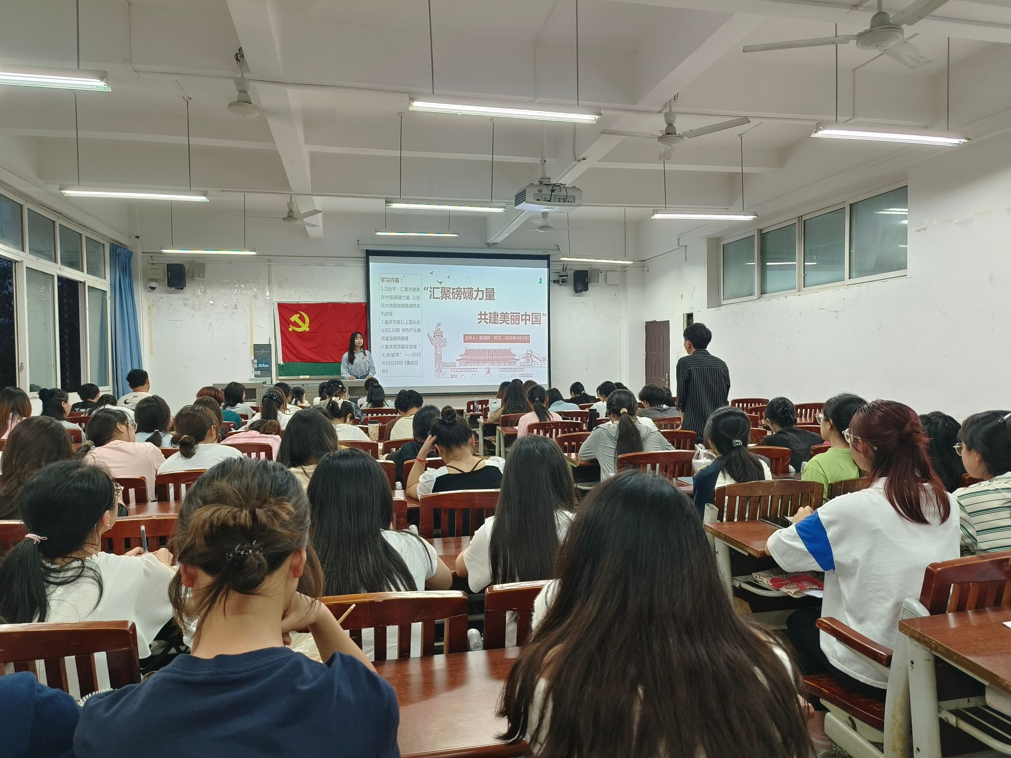 活动伊始,主讲人崔益熙同志首先指出,习近平总书记强调,植树造林是生态文明建设的重要一环。借用塔克拉玛干沙漠绿化等例子向同学们展示了我国绿化祖国的决心。崔益熙同志结合生活实际,提到了万州区建设城市公园,本市企业发展高质量绿色产业,以响应国家号召,推动绿色发展。最后,崔益熙同志就如何推动绿色发展这一问题表达了自己的看法,同学们也踊跃发言,并提到会结合自己所学专业,创新参与绿色发展的方式,积极参与美丽中国的建设。