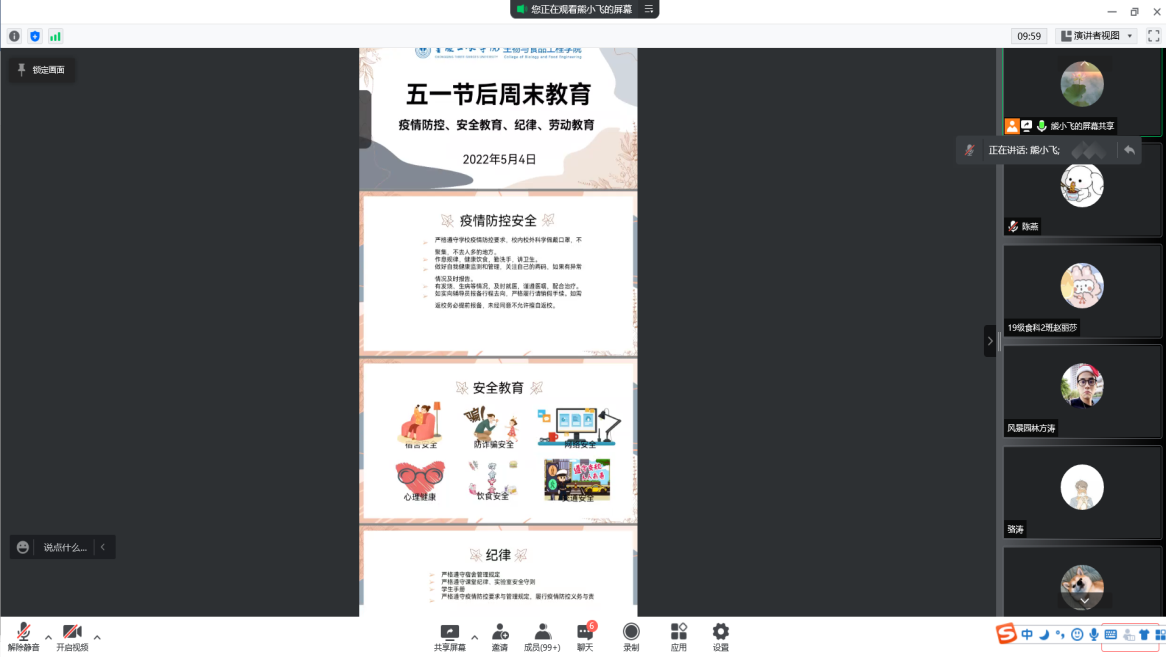 5月4日,为做好五一假期员工收心工作,落实疫情防控常态化下员工管理要求,提升公司员工遵纪守法意识,公司学工办全体辅导员分年级召开五一收假线上专题教育会议。