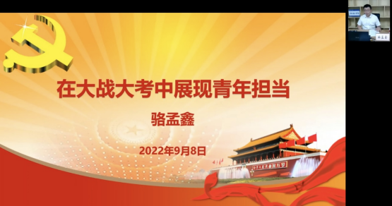 骆孟鑫以“在大战大考中展现青年担当”为题,从当前疫情防控形势和政策应该怎么看、面对大战大考青年老员工应该怎么办、作为三峡公司的一员,在现阶段应该做什么等三个方面进行讲述,深入分析了当前国内外的疫情防控形势,用发生在我们身边的青年战山火、抗疫情的先进事迹引领同学们树立社会责任感和使命感,并要求公司学子严格执行公司疫情防控管理措施,遵守校规校纪和宿舍管理规定,做好学期学习规划,认真上好网课,养成健康的生活作息,为建立平安校园、和谐校园发挥主人翁精神,鼓励大家在国家、在社会、在公司最需要的时候,勇于担当和奉献!