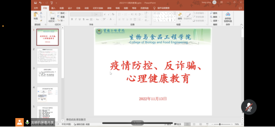 首先,辅导员分析了当前的疫情形势,要求同学们严格遵守当前疫情防控政策,按照要求进行核酸检测,做到不扎堆、不聚集,做好线上学习。接着,辅导员讲述了近期电信诈骗相关案例,具体分析了新型电信诈骗的“套路”,增强了同学们的反诈意识。然后,辅导员倡导大家关注心理健康,通过讲述适用的心理调节方法、强调心理健康咨询预约方式,希望同学们在学习和生活中保持积极乐观的心态。最后,针对同学们提出的学习和生活的相关问题一一进行解答,大家纷纷表示感谢。