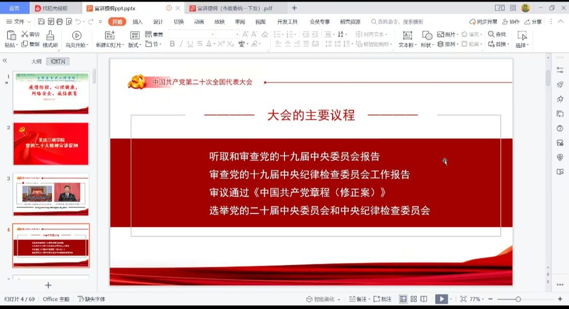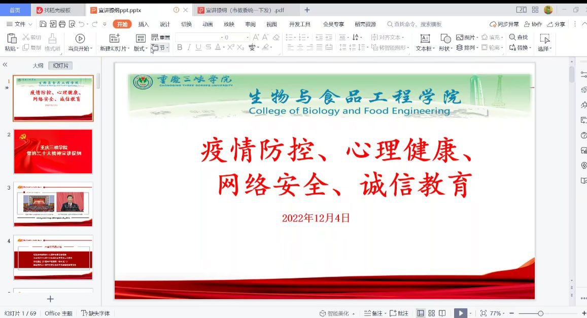 会上,辅导员首先分析了当前的疫情形势进行了,告知全体员工提前返乡的流程以及相关注意事项。接着,辅导员提醒同学们在疫情形势下积极调整自己的心态,明确复习计划,合理运用时间,诚信考试。并再次提醒同学们注意各类网络诈骗,提高安全保护意识。最后,通过宣讲二十大精神的相关内容,希鼓励大家深刻学习二十大的精神内涵。