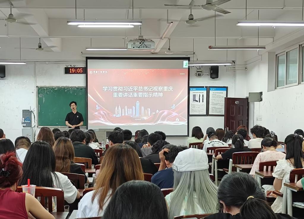 会上,辅导员从习近平总书记重庆行概况及重要指示精神、习近平总书记听取重庆市委和市政府工作汇报,发表重要讲话主要精神、习近平总书记在重庆主持召开新时代推动西部大开发座谈会,发表重要讲话主要精神、深入学习贯彻习近平总书记视察重庆重要讲话重要指示精神工作要求四个方面开展宣讲,让同学们更加深刻地理解习近平总书记赋予重庆新的时代使命和战略定位,引导同学们努力学习,积极作为,为重庆高质量发展贡献力量。