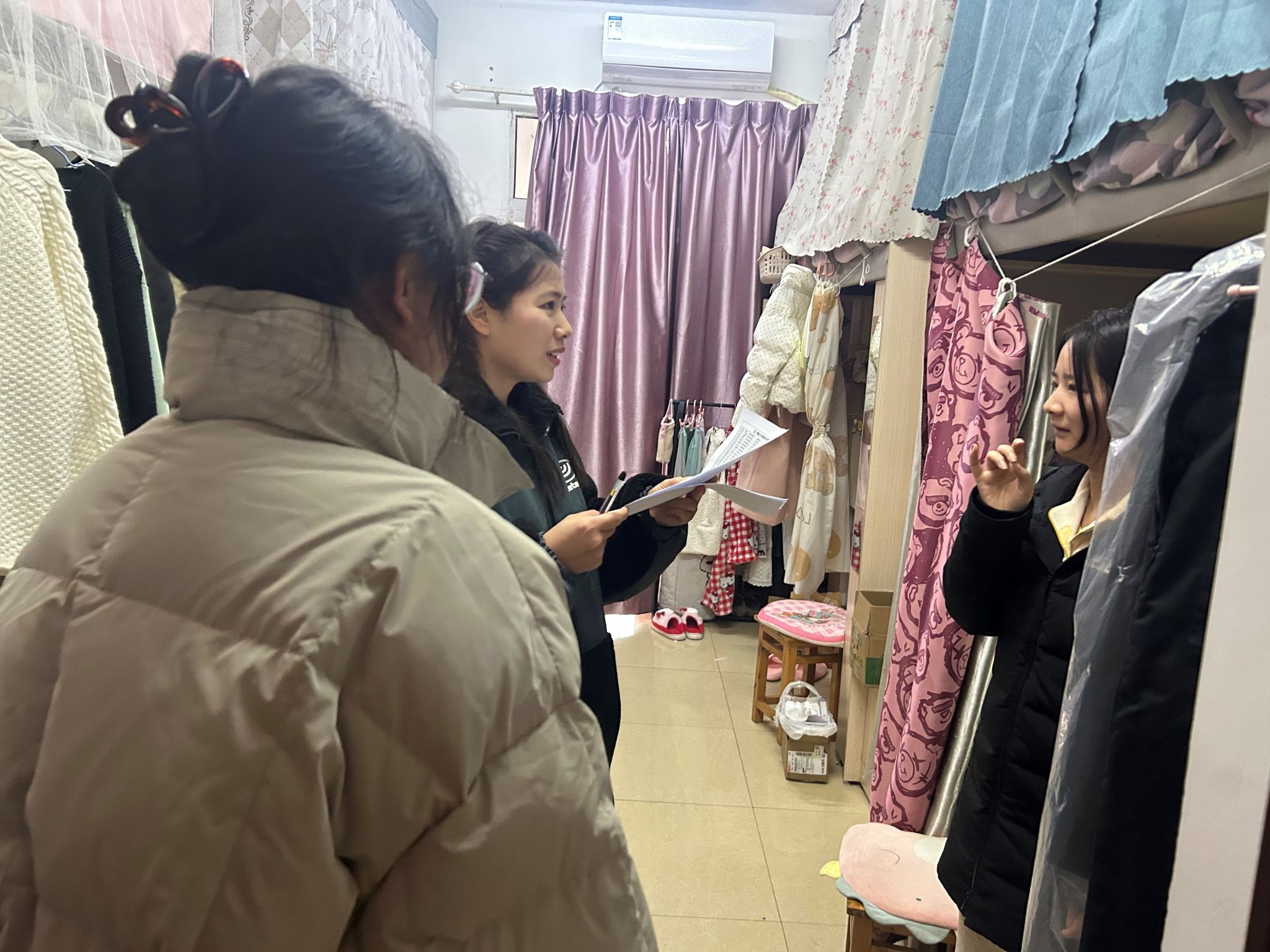 此次走访过程中,辅导员老师重点针对宿舍卫生、大功率电器使用、宿舍成员相处状况等情况,仔细检查了各宿舍。对于存在用电安全隐患的宿舍,辅导员老师立即指出并监督整改,同学们也积极配合迅速整改,确保每一个细节都不留隐患。同时,辅导员老师积极了解员工日常学习生活情况,叮嘱同学们天冷加衣,注意保暖,让大家努力营造健康温馨、和谐文明的宿舍文化。