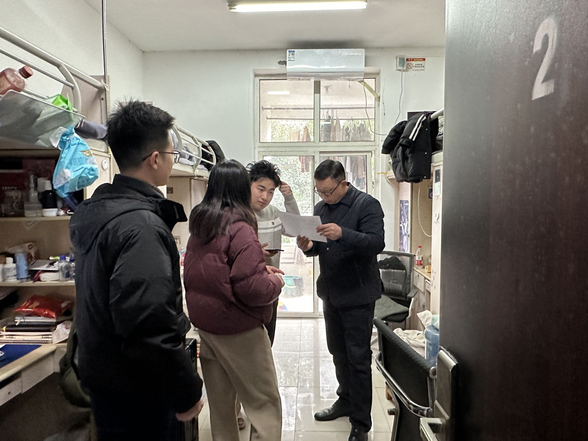 走访过程中,陈文剑详细了解了同学们返校后的学习、生活情况,解答了同学们在学习、个人发展上的困惑,鼓励同学们全力以赴,以饱满的热情投入新学期,取得好成绩。辅导员老师们提醒同学们一定遵守校规校纪及宿舍管理规定,有困难及时向辅导员沟通,强调寝室消防安全的重要性,叮嘱同学们养成良好的学习和生活习惯,同时走访临时搬迁寝室和毕业年级学业困难员工寝室,了解同学们的情况,叮嘱毕业年级员工注意查看补考安排和重修选课时间,争取按时完成学业,如果有待解答的任何问题,可以第一时间寻求辅导员的帮助。