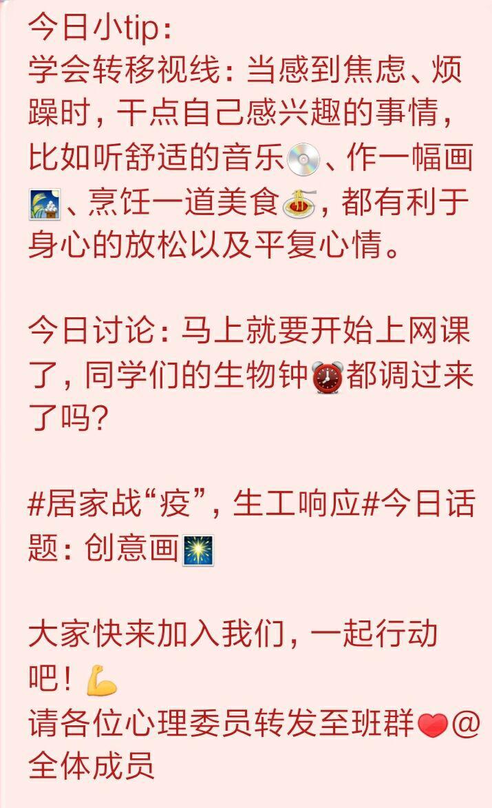2月22-24日,主要进行疫情心理健康方面的疏导。活动期间,由公司员工会心理健康部每日发布心理健康小贴士,向同学们分享如何充实时间,放松心情,缓解焦虑等。活动初期,小贴士分成三个板块:一是提供减压方式;二是每日份讨论话题;三是号召同学们参加“生工响应,居家战‘疫’”打卡活动。2月25日至3月5日,主要进行学习压力方面的疏导。通过咨询各班学习委员,了解到同学们在线上学习时,导致出现焦虑的现象,针对同学们提出的意见,积极做出相应措施,有效解决同学们的问题,缓解学习压力。