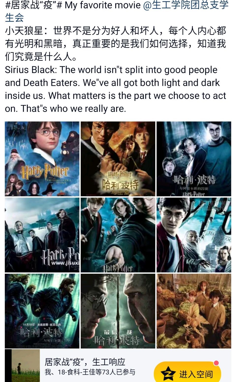 “汇聚青春正能量,同心战‘疫’显担当”。公司积极响应国家的号召,开展“居家战‘疫’,生工响应”线上打卡活动,公司同学积极参与其中。本次打卡活动旨在丰富居家生活的同时,拓宽同学们的知识面,通过线上打卡互动,分享电影,感受居家陪伴家人的温情。