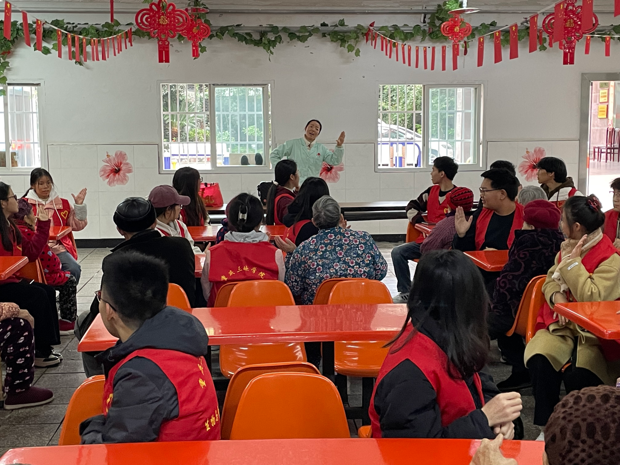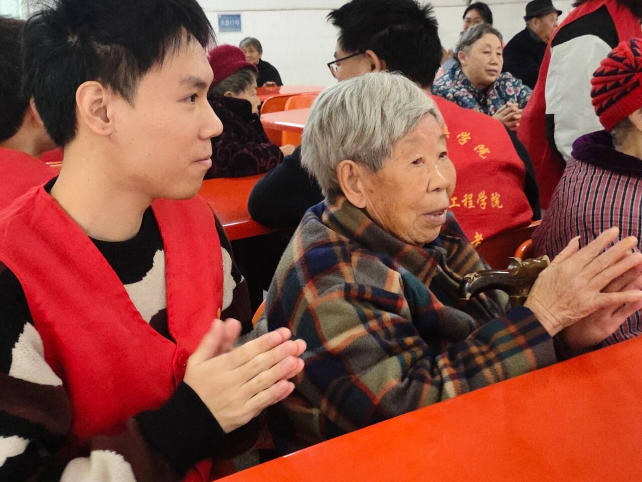 志愿者们一到现场就扶着老人们入座,陪他们聊天,耐心倾听他们的故事和心声,交谈声回荡在每个角落。志愿者们还为老人们精心准备了文艺表演。动听的歌声,欢快的手势舞,一个个节目精彩纷呈,老人们看得津津有味,不时发出阵阵掌声和欢笑声。在陪老人们玩乐的同时,志愿者们也不忘老人们的身心健康,许多志愿者轮流上台为老人们普及有关养生和健康的知识,老人们听了不禁点头表示赞同。
