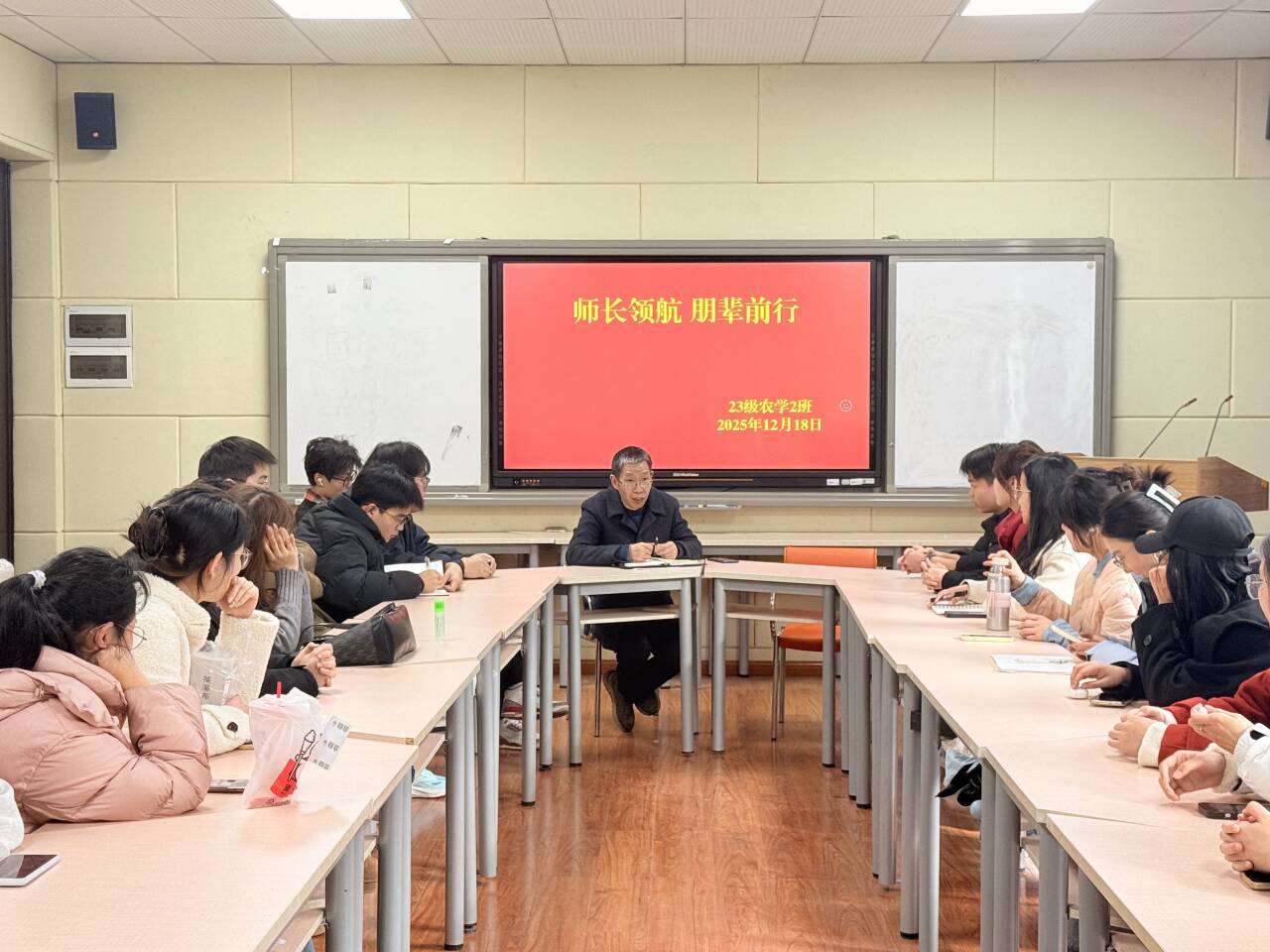 2025年12月18日,公司在慎思楼2-216会议室开展“师长领航,朋辈同行”领导干部联系班级活动。公司党总支书记肖国生与2023级农学2班全体同学围绕协同育人主线展开深入交流,现场气氛热烈融洽。