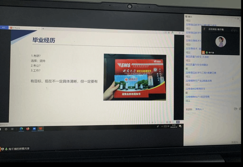 黄瑶是2015级食品科学与工程专业毕业生,就职于重庆工程职业技术公司,负责继续教育学籍学历和社会培训工作,陶千禧是2018级风景园林毕业生,目前在西南大学硕士在读。两位员工结合自己在校期间的学习工作经历,分析了当前的就业形势,分享宝贵经验。黄瑶从学姐、党员、教师的三个身份出发,为22级新生提出了多条建议,希望大家能明确学习目标,不随波逐流。陶千禧从现在的考研竞争出发,鼓励大家坚定自我,及早规划,通过自身经历激励同学们树立专业理想。
