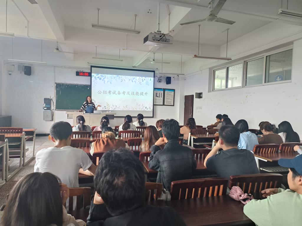 辅导员对公务员和事业单位的考试科目、时间安排、报考要点等进行详细介绍;从了解考试大纲、制定合理复习计划、积累知识点、多做真题多练习、培养答题技巧和保持良好的心态六个方面引领同学们进行技能提升。辅导员还结合自身考编经历,告诉同学们要多积累经验,不要害怕失败。本次活动让同学们对公招考试有更清晰的了解,增加了其备考信心。