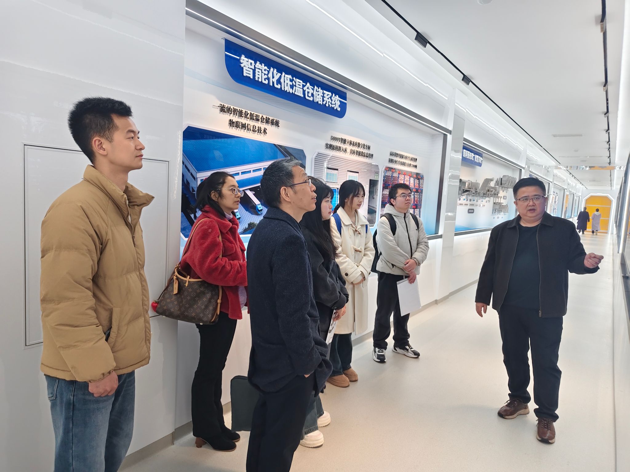 在企业负责人王总的陪同下,公司一行首先参观了企业宣传展厅,集中观看了企业宣传视频,深入了解了公司的发展历程、业务布局、智能化低温仓储系统运行情况以及一线生产流程。通过实地走访,师生们对企业现代化运营模式和产业特色有了更直观的认识。随后,双方举行了座谈交流会。